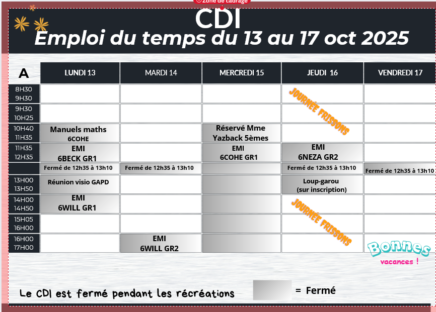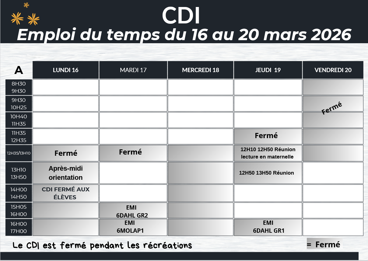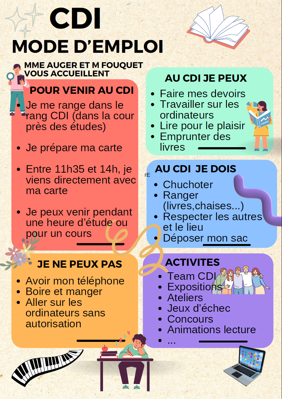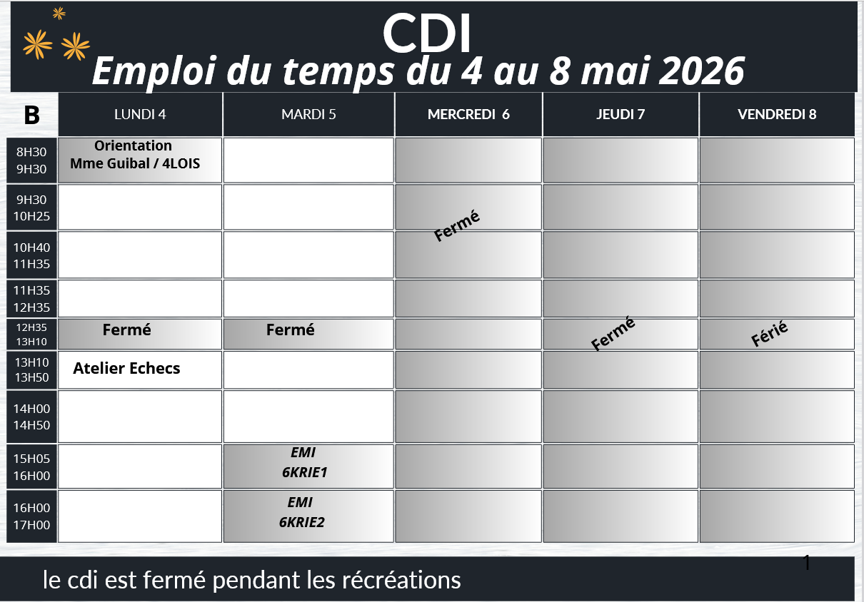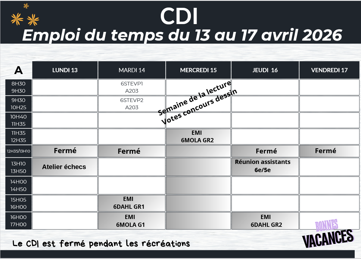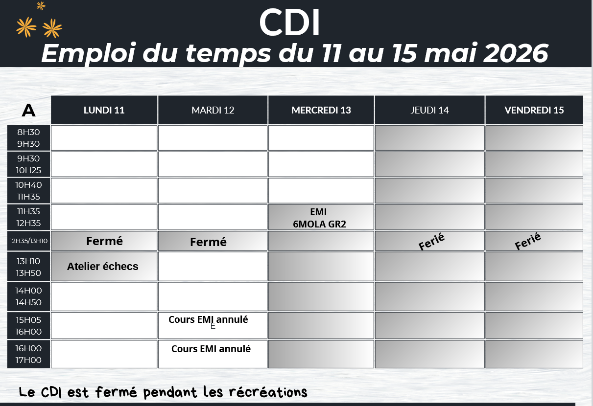 Bienvenue au CDI Dans cette rubrique, le planning hebdomadaire et le mode d'emploi du CDI