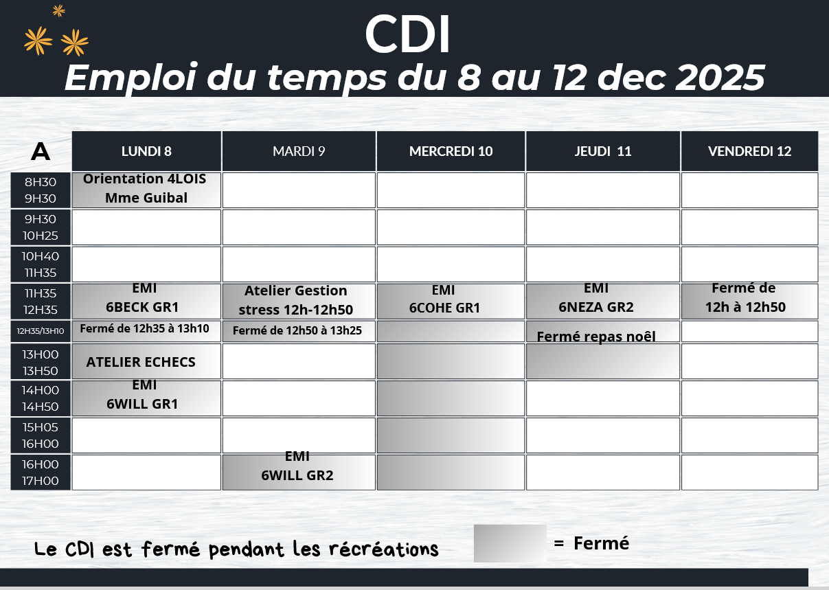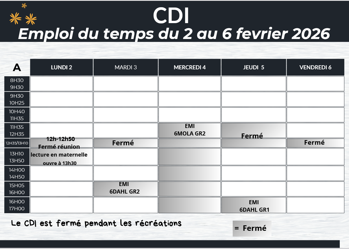 Bienvenue au CDI Dans cette rubrique, le planning hebdomadaire et le mode d'emploi du CDI